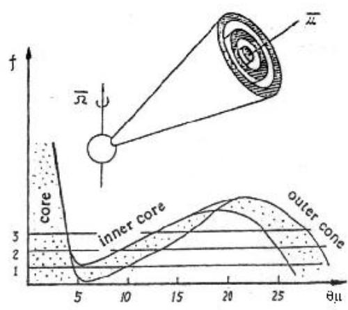 这个模型不仅具有理论上的优点,不需要特别高的电子能量,(RS模型要求电子的相对论因子达到 γ∼107 左右,这里只需要 ⋅γ∼103 左右),而且能解释的观测现象很多,最重要的是能同时给出目前流行的“核-双锥”模型的核、内锥和外锥辐射。图(7.6)是该模型给出的辐射束形状和频率与θ角(视线和磁轴的夹角)的关系。这个图象和由分析脉冲星PSR1451-68的6个频率的平均脉冲所得的图象(图6.14)完全一致。