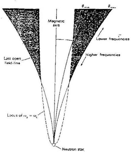 从几何上考虑,辐射锥角的外边缘应由极冠区最外面一根开放磁力线决定,根据偶极场磁力线方程(见第八章)可以推导出