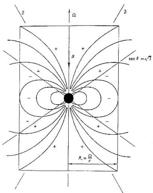 图(7.1) 是GJ磁层模型。 rc 为光速园柱半径,+和-代表正负电荷, se c θ=3 为零电荷面。由于磁层中的各处的磁场及方向不同,各处感应电场的方向和大小也都不一样。磁层里的电荷是分离的,正负电荷处在不同的区域。在磁轴和自转轴反平行的情况下,磁轴附近是正电荷区。磁赤道区是负电荷。