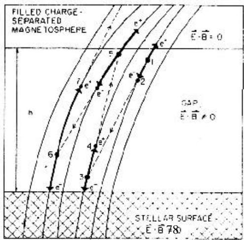 由中子星结构的研究得出:强磁场中,中子星表面物质的正离子被束缚着,不可能跑到磁层中去。磁层中的电荷是分离的,在磁极轴和自转轴是反平行的情况下,在磁极区的上空是正电荷。当有某一扰动导致正电荷向外流动时,中子星表面不能提供沿磁力线流动所需要的正电荷,因此在中子星表面附近形成一个电荷抽空的区域,也就是形成了一个“间隙”。当“间隙”形成时,电荷电流中断,相当于回路中该处的电阻增到无穷大,因而感应电势全部加在“间隙”两边。在“间隙”中的带电粒子可以获得加速,所以“间隙”成为一个理想的加速器,成为高能电子的源泉。