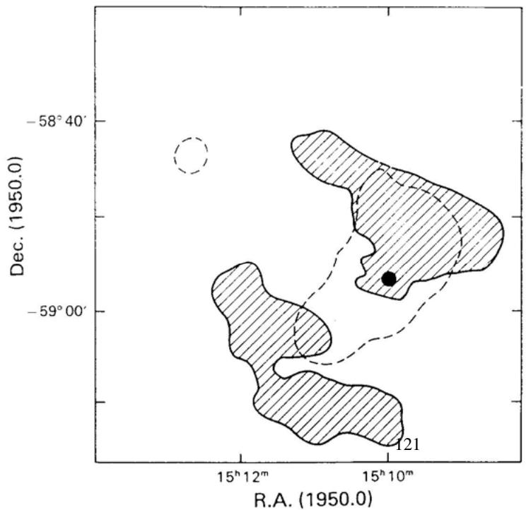 图 (10.3) 是 脉 冲 星PSR1509-58和相联系的超新星遗迹。影线部分是超新星遗迹射电展源,虚线包围的部分是X射线辐射展源,黑点是脉冲星,它在射电和X射线波段都有脉冲辐射。