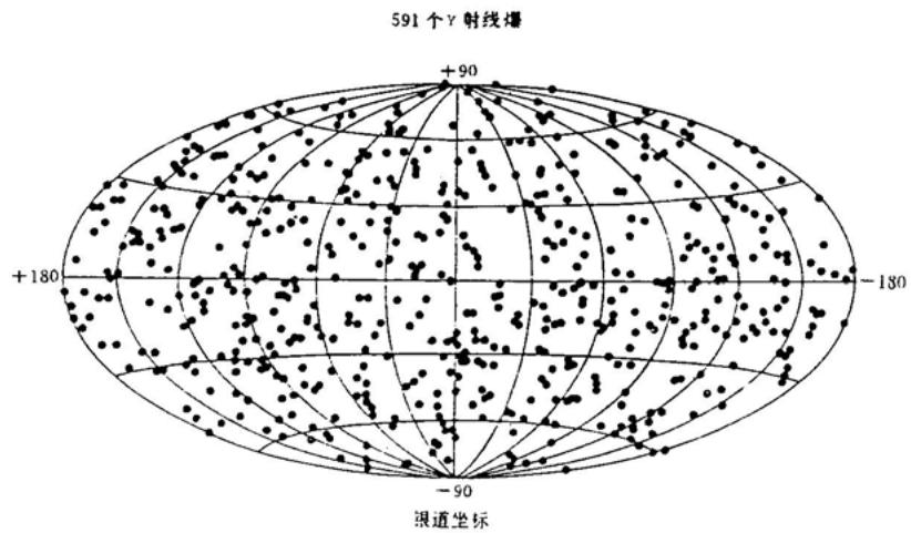 最近的观测显示出γ爆的空间分布高度地各向同性,使银河系晕模型遇到困难(见图(10.6))。人们重新对宇宙学模型发生兴趣,即认为γ爆来自银河系之外,这样便能解释高度地各向同性。
