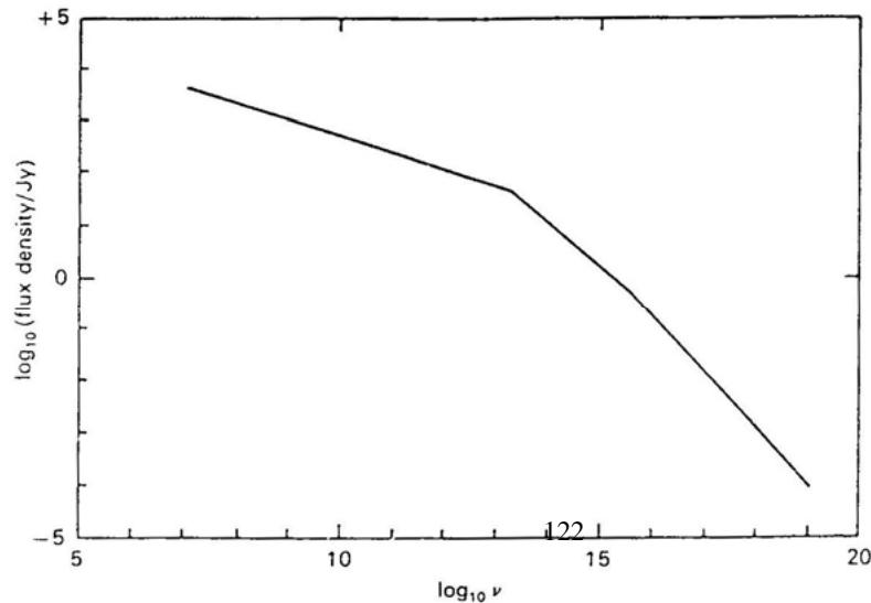 蟹状星云首先作为射电源被确认,射电辐射比光学辐射强,不能用电离气体的热辐射来解释。1953年苏联天文学家什克洛夫斯基用高能电子沿弯曲磁力线运动的曲率辐射来解释,这和以前提出的同步辐射是一致的。同步辐射的频率很宽,有很强的线偏振。蟹状星云的辐射覆盖了整个射电波段:从波长30米到3毫米。光学观测扩展到红外,从500毫微米到5000毫微米(nm)。X射线和γ射线观测的能量范围从0.5kev到500kev,相当于波长为3毫微米到0.003毫微米。整个频率覆盖范围为 赫兹,达13个数量级。图(10.4)是蟹状星云连续谱辐射频谱,从射电波段一直到γ波段。这些不断辐射的总和约为