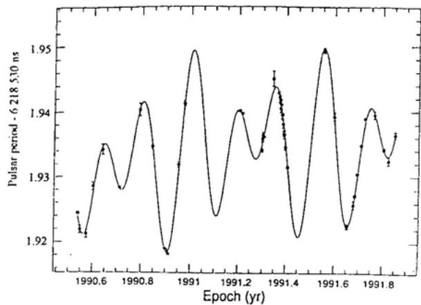 图(9.8)是脉冲星PSR1 脉冲到达时间的观测结果,和射电脉冲双星的观测结果不同,这是由于它至少有两颗行星系统。理论拟合结果表明,这颗脉冲星的一颗行星离脉冲星大约5400万公里,公转周期为66.6天,另一颗行星离开脉冲星大约7000万公里。公转周期为98.2天.它们的质量分别为 3.4 和 2.8个地球质量。这一重大发现是太阳系之外存在行星系统的直接的观测证据。