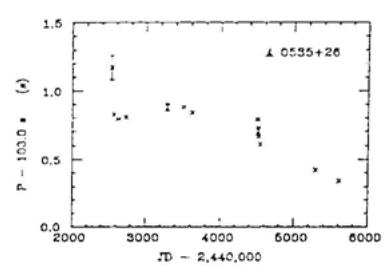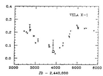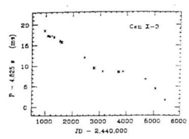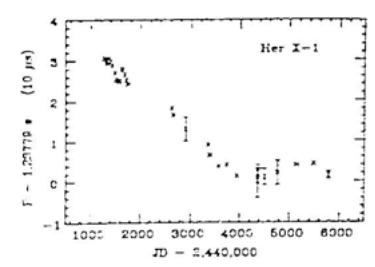从图(9.4)可以看出,Her X-1,CenX-5和 的周期变化趋势明显,越来越短,但也有变长的时段。而Vela X-1周期变化的起伏很大。