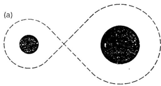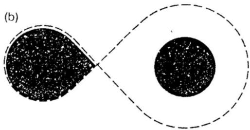 在双星系统中的物质受力的情况比单星复杂,任何地方的物质要受到两颗星的引力作用,还会受到轨道运动所产生的离心力的作用。19世纪中期,法国数学家洛希提出一种描写双星周围的引力情况的方法,称之为洛希瓣。图(9.2)所示的横躺着的8字就是洛希瓣,唯有在交叉点上的物质所受的力为零,两个子星只能通过这个点交换物质。其它地方的物质则分别由两个子星的引力控制。当一个子星膨胀至洛希瓣时,物质就通过交叉点陆续转移到另一个子星,物质不会跑出洛希瓣,所以洛希瓣被称为恒星的最大体积。图(9.2a)是不相接双星,虚线是洛希瓣,双星的两颗子星都在虚曲线之内。图(9.2b)是半相接双星,左边的恒星正好充满洛希瓣。
