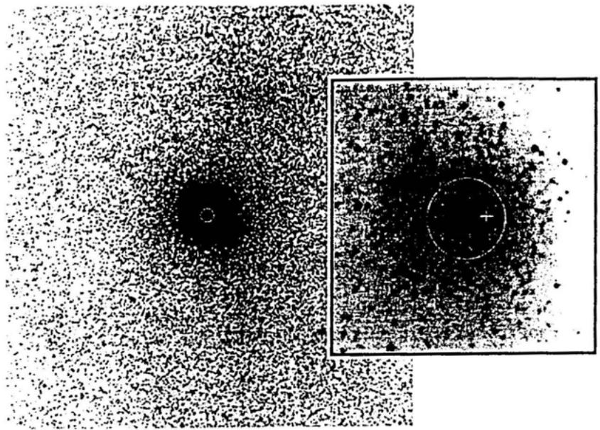 图(9.5)球状星团M28和毫秒脉冲星PSRB1812-25,圆圈的半径为20弧秒, 代表脉冲星。