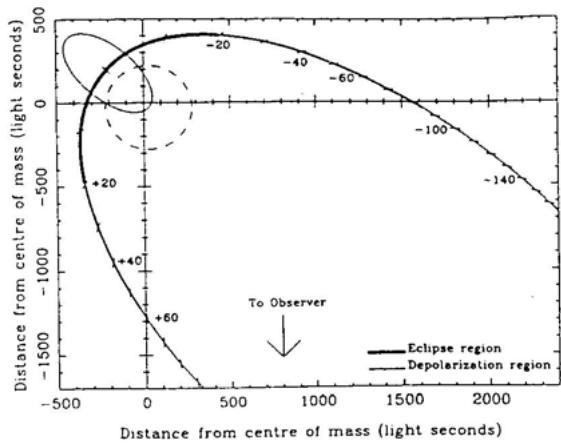 图(9.7)给出其部分轨道,纵坐标和横坐标分别表示离双星系统质量中心的距离,轨道上标出以天为单位的时间间隔。左上角的虚线小圆是Be伴星(SS 2883)的大小,实线椭圆是伴星的运动轨道。当中子星在靠近伴星的几个月中,即图左上角的粗线部分,受伴星的星风的掩食影响,观测不到射电脉冲,其余时间里则表现为一颗年轻的脉冲星,年龄为 年,磁场较强 高斯。这一双星系统有可能是PSR1913+16那样双中子星系统的前身星。观测到掩食前后外流气体所导致的色散量、散射和旋转量的明显变化,因此可以研究恒星大气的电子密度和磁场。