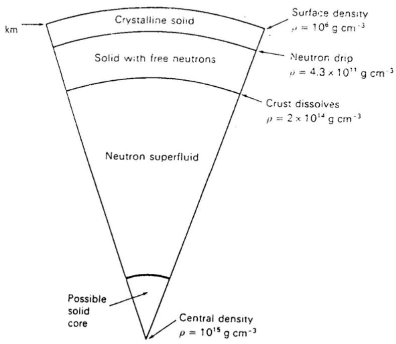 典型的中子星模型如图(3.3)所示,它的壳层大约厚1公里,密度从外向里逐步增加。外壳的密度为 克/厘米3 ,恰好是符合逆β衰变过程的条件,由富中子核和核外的电子气组成。由原子核构成的固体外壳具有很高的刚性。