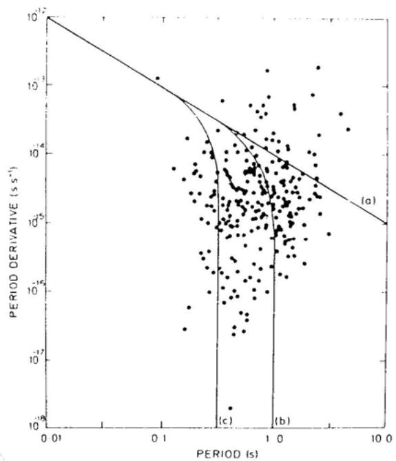 图(5.2) 脉冲星在P&−P图上的演化方式。