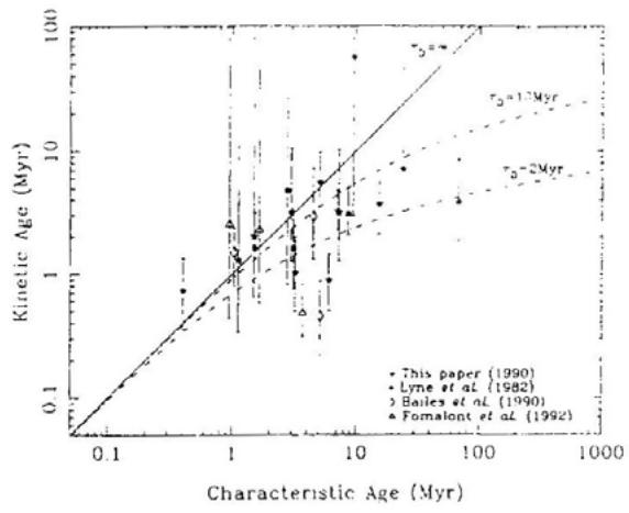 图(5.1)脉冲星运动学年龄和特征年龄的关系图。